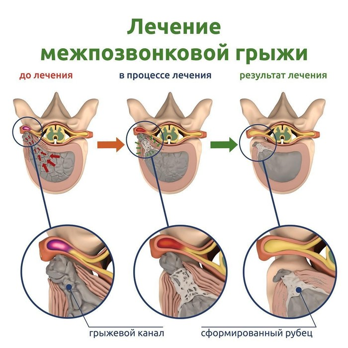 Фактически тело само избавляется от структуры, которую воспринимает как чужеродную. Макрофаги поглощают кусочки хряща, ферменты расщепляют ткани, отчего грыжа уменьшается. Позже происходит естественное ремоделирование. Пространство заполняется плотной рубцовой тканью, которая перестаёт раздражать нервные корешки.